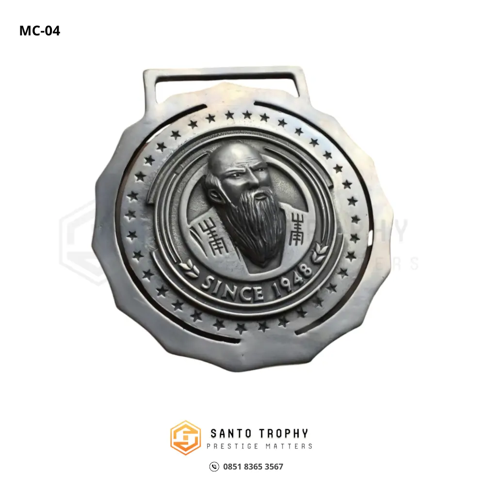 Medali ini berdiameter 7 cm dengan ketebalan ideal 3 mm. Ukuran tersebut menghadirkan kesan prestisius tanpa menambah beban berlebih. Selain itu, finishing antique silver memperkuat detail logo wajah dan teks “Since 1948”, sehingga tampil lebih tegas dan berkelas.
