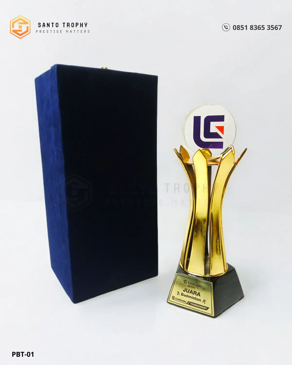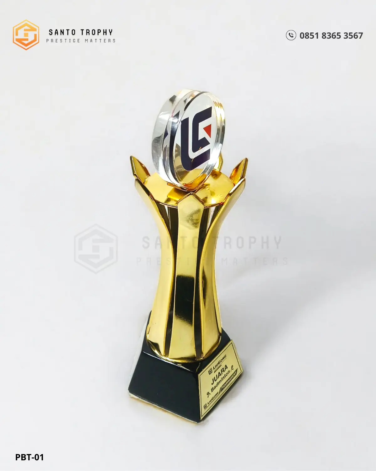 Trofi ini berdiri setinggi 30 cm dengan berat 1 kg. Kami memakai material tin copper dengan finishing gold untuk menciptakan tampilan kokoh, modern, dan mewah. Bagian atas memakai akrilik tebal yang menonjolkan logo LiuGong secara jelas. Pada base, Santo Trophy memasang plat kuningan teknik EDSA untuk memberi tulisan event yang rapi dan presisi.