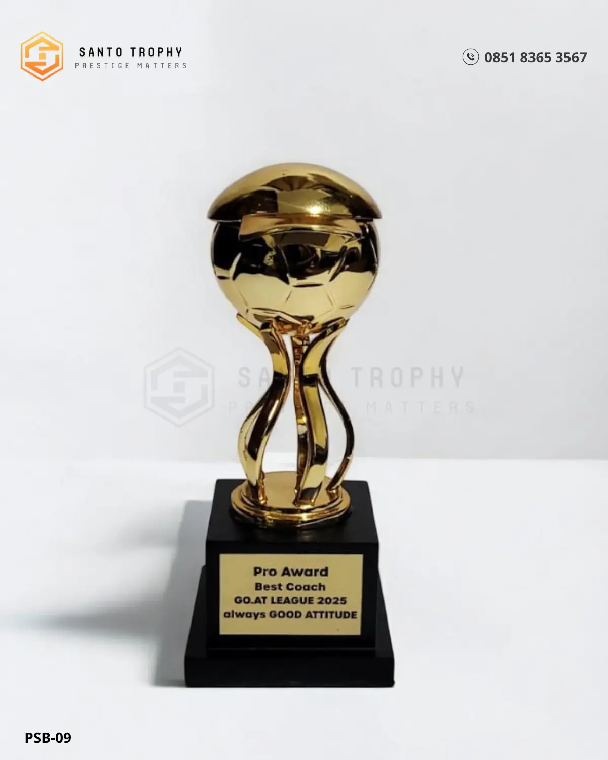 Piala Sepak Bola Best Coach GO.AT League 2025 menonjolkan desain bola dengan topi coach. Bentuk ini langsung menggambarkan identitas pelatih di kompetisi GO.AT League. Event ini terkenal sebagai ajang futsal dan sepak bola komunitas dengan format profesional. Panitia biasanya memberikan penghargaan untuk kategori seperti Top Score, Best Goalkeeper, Best Coach, dan Attitude Award. Setiap kategori menilai sportivitas, strategi, dan perkembangan tim.