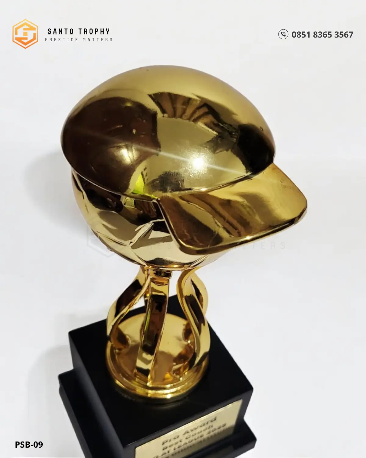 Finishing gold import Taiwan pada body piala memantulkan cahaya dengan kuat. Warna emasnya terlihat mewah dan bersih. Santo Trophy memakai material tin copper agar setiap detail tetap presisi. Lekukan bola, bentuk topi, dan struktur penyangga tampil tegas karena material ini mampu menjaga ketajaman bentuk.