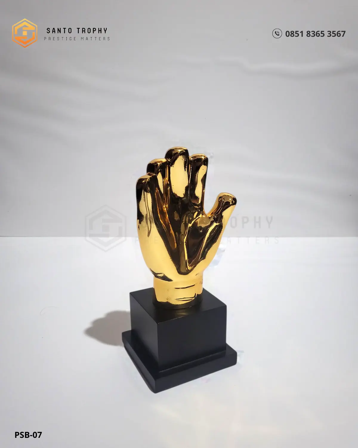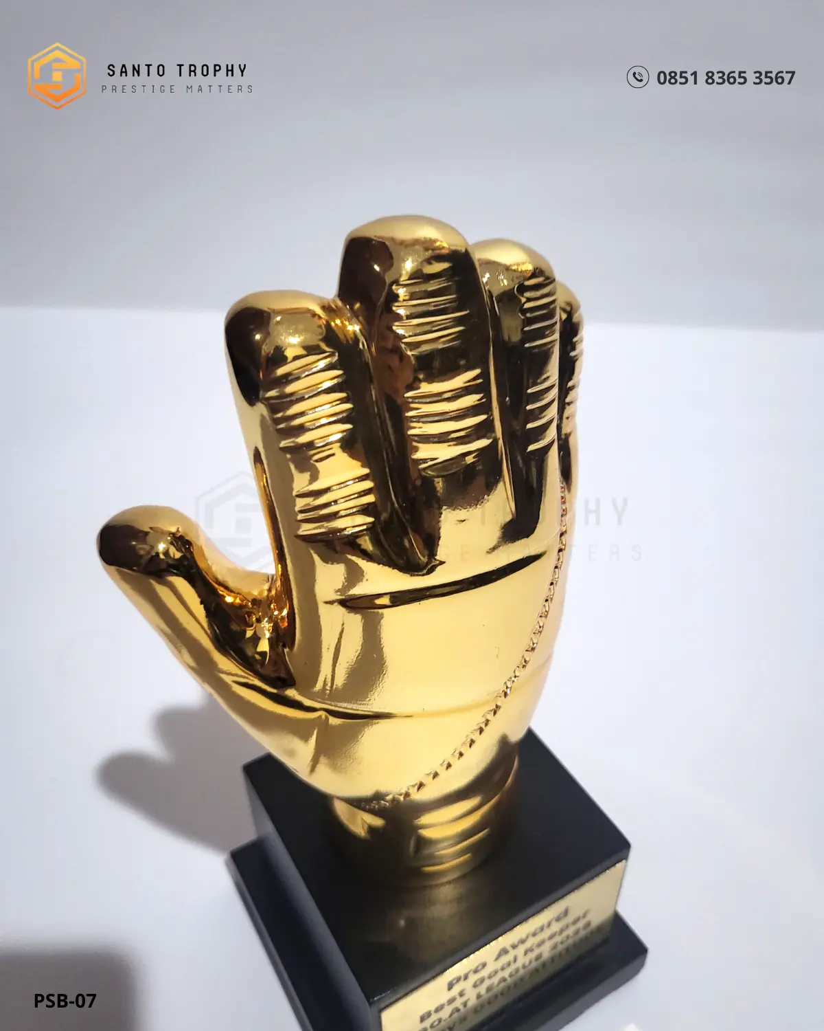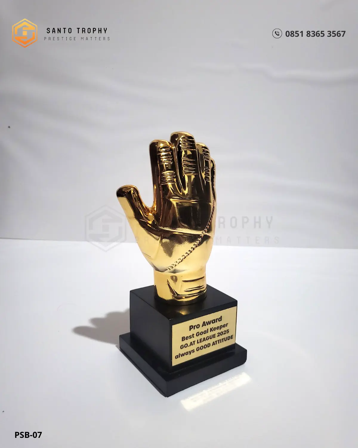 Bagian base memakai material kuat dengan warna hitam matte. Kontras ini membuat sarung tangan emas terlihat lebih tegas. Kami memasang plat engraving agar Anda dapat menampilkan nama juara, kategori penghargaan, dan label resmi GO.AT League 2025.
